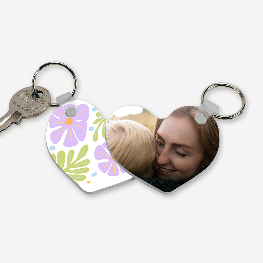 Com formato de coração e personalização total (100%) em ambas as faces, este porta-chaves transforma qualquer foto ou frase num presente romântico e inesquecível.